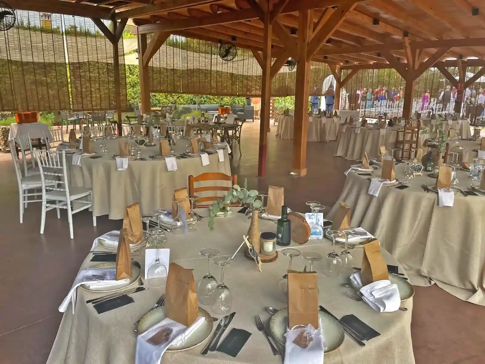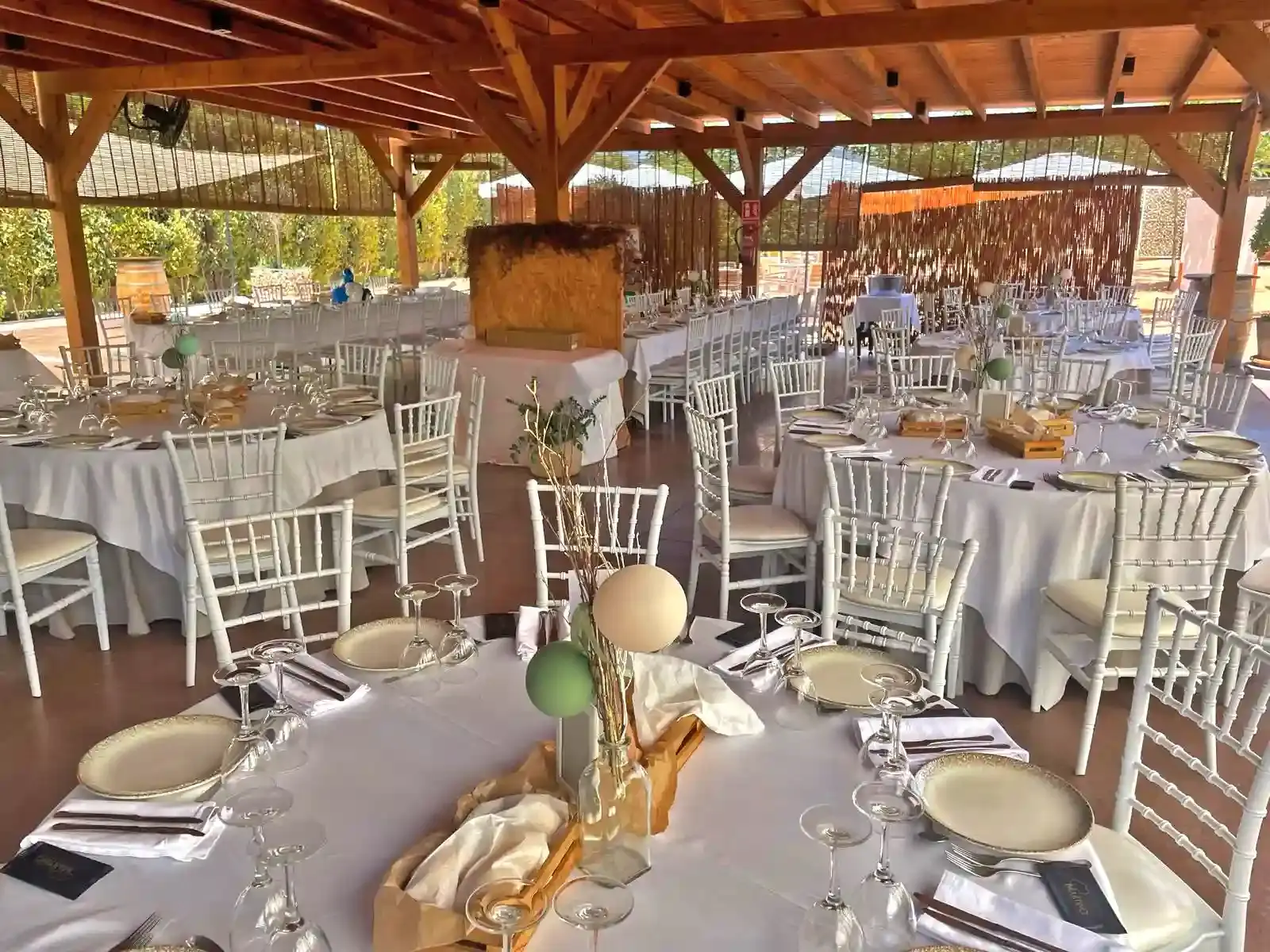 Las mesas están elegantemente dispuestas, cada una vestida con manteles de lino en tonos neutros que realzan la simplicidad y elegancia del ambiente. Las sillas blancas y de madera, combinadas con los detalles en la decoración, proporcionan un contraste armonioso que invita a sentarse y disfrutar de una comida memorable. Cada lugar está meticulosamente preparado con utensilios de alta calidad y detalles personalizados que hacen que cada comensal se sienta especial.